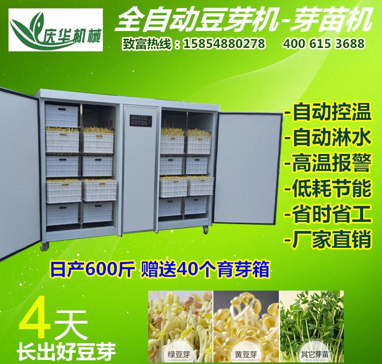 5、豆芽機(jī)產(chǎn)品特點(diǎn): 1)我公司生產(chǎn)的全自動(dòng)綠色無(wú)污染豆芽機(jī),是現(xiàn)代技術(shù)與傳統(tǒng)工藝的結(jié)合。豆芽機(jī)通過(guò)微電腦自動(dòng)控溫、自動(dòng)加溫、自動(dòng)顯示溫度、自動(dòng)淋水,實(shí)現(xiàn)了生產(chǎn)過(guò)程的全自動(dòng)化,具有省時(shí)、省工、低耗、無(wú)噪音等特點(diǎn)。 2)用我公司豆芽機(jī)生產(chǎn)的豆芽比傳統(tǒng)手工生產(chǎn)周期短質(zhì)量好,一般手工生產(chǎn)豆芽的周期,夏季需4-5天,冬季需要7-8天,而豆芽機(jī)生產(chǎn)豆芽只要3-4天即可,且不受地理環(huán)境、氣候條件和季節(jié)的影響。 3)我公司豆芽機(jī)生產(chǎn)的豆芽不僅種類多,而且產(chǎn)量高,一斤豆種可生產(chǎn)10斤左右的豆芽。且人工控制的環(huán)境下,豆芽生長(zhǎng)均勻一致,潔白鮮嫩、清脆多汁,口感清爽;不僅食用安全、營(yíng)養(yǎng)豐富,還具有一定的食療保健作用。 4)節(jié)省勞力,操作方便。將浸泡后的豆種放進(jìn)豆芽機(jī)育芽箱內(nèi),就不用管了,它會(huì)自動(dòng)加溫,自動(dòng)淋水,經(jīng)過(guò)3-4天時(shí)間就可生產(chǎn)出潔白脆嫩的豆芽。 5)減少爛芽現(xiàn)象。豆芽生長(zhǎng)的爛芽現(xiàn)象多發(fā)生在培育后的三天左右,由于手工生產(chǎn)豆芽的周期長(zhǎng),易出現(xiàn)爛芽現(xiàn)象,然而采用豆芽機(jī)生產(chǎn),三天左右豆芽已經(jīng)成熟,可以采收食用,不會(huì)有爛芽現(xiàn)象發(fā)生。