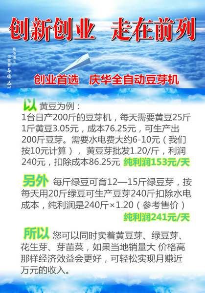 1)我公司生產(chǎn)的全自動綠色無污染豆芽機(jī),是現(xiàn)代技術(shù)與傳統(tǒng)工藝的結(jié)合。豆芽機(jī)通過微電腦自動控溫、自動加溫、自動顯示溫度、自動淋水,實(shí)現(xiàn)了生產(chǎn)過程的全自動化,具有省時、省工、低耗、無噪音等特點(diǎn)。