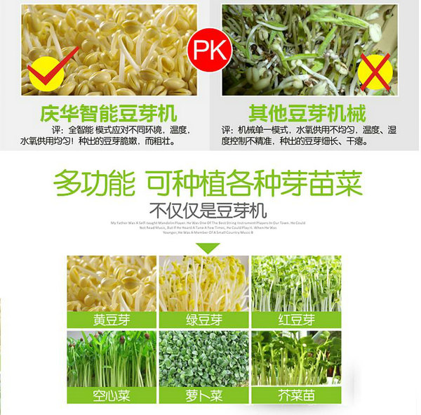 4)節(jié)省勞力,操作方便。將浸泡后的豆種放進(jìn)豆芽機(jī)育芽箱內(nèi),就不用管了,它會自動加溫,自動淋水,經(jīng)過3-4天時間就可生產(chǎn)出潔白脆嫩的豆芽。