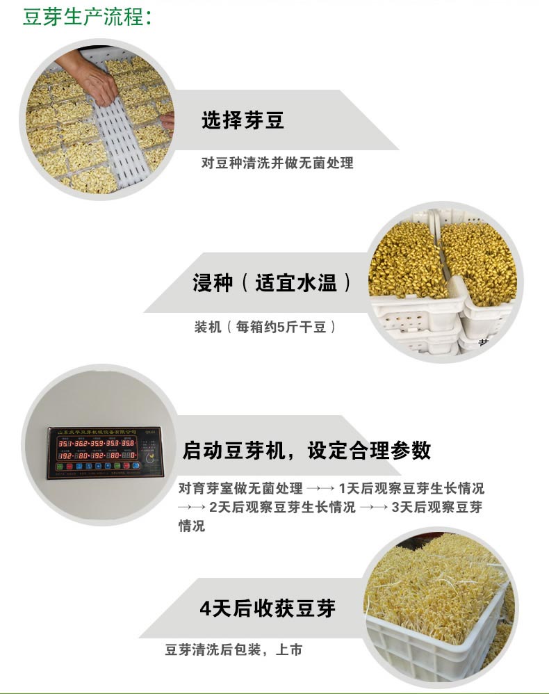 5、豆芽機產(chǎn)品特點: 5)減少爛芽現(xiàn)象。豆芽生長的爛芽現(xiàn)象多發(fā)生在培育后的三天左右,由于手工生產(chǎn)豆芽的周期長,易出現(xiàn)爛芽現(xiàn)象,然而采用豆芽機生產(chǎn),三天左右豆芽已經(jīng)成熟,可以采收食用,不會有爛芽現(xiàn)象發(fā)生。